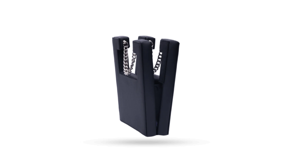 The Centaurus A handbag stands out for its cosmic-inspired design, sculptural silhouette, and dual chain handles, all crafted from premium upcycled vegan leather.