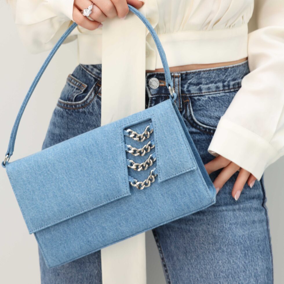 The Magellanic Blue Denim Shoulder Bag with Upcycled Waterproof Lining and Chain Detail blends conscious craftsmanship with timeless style.